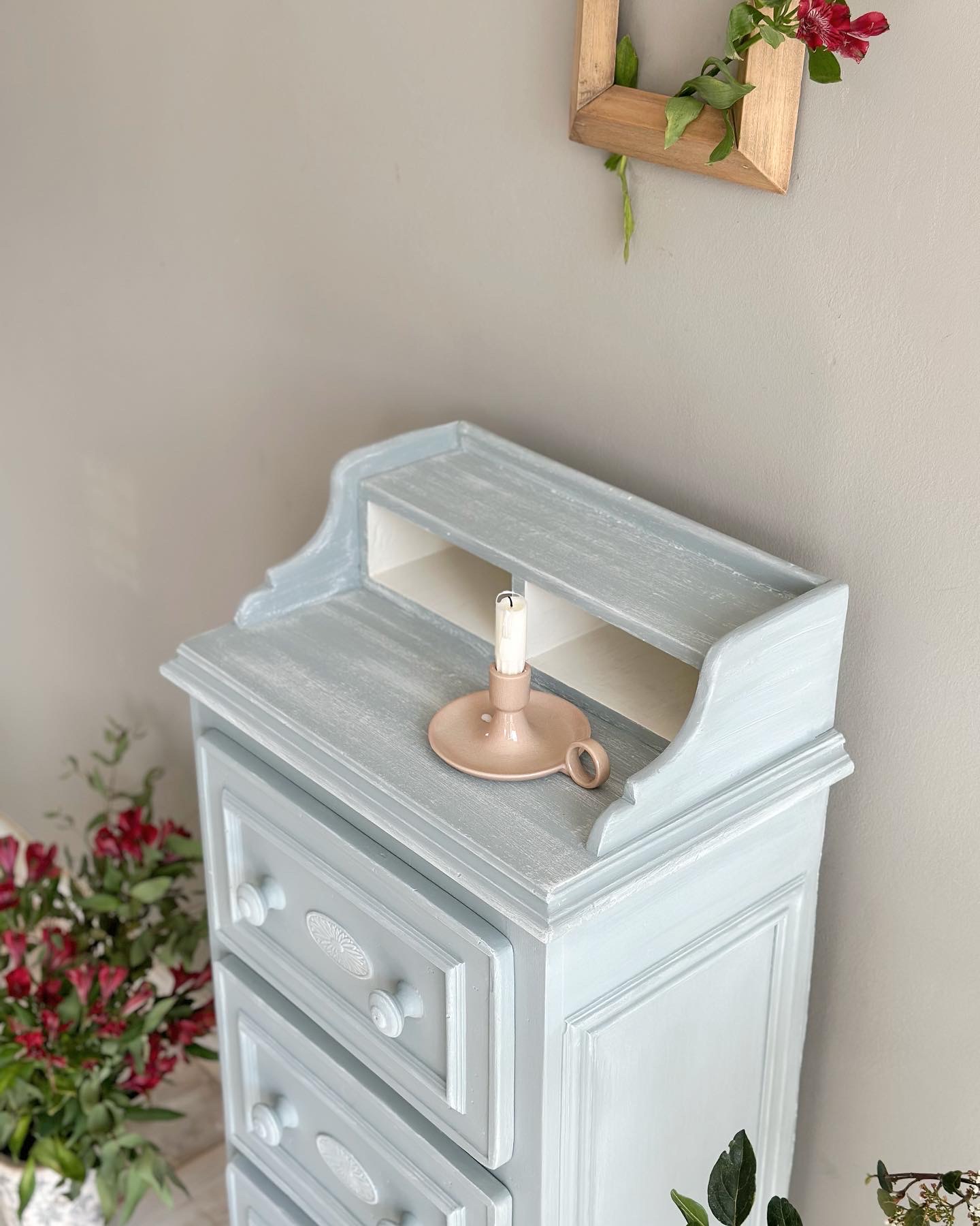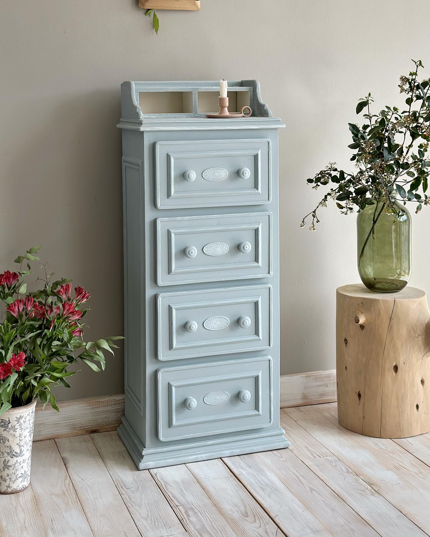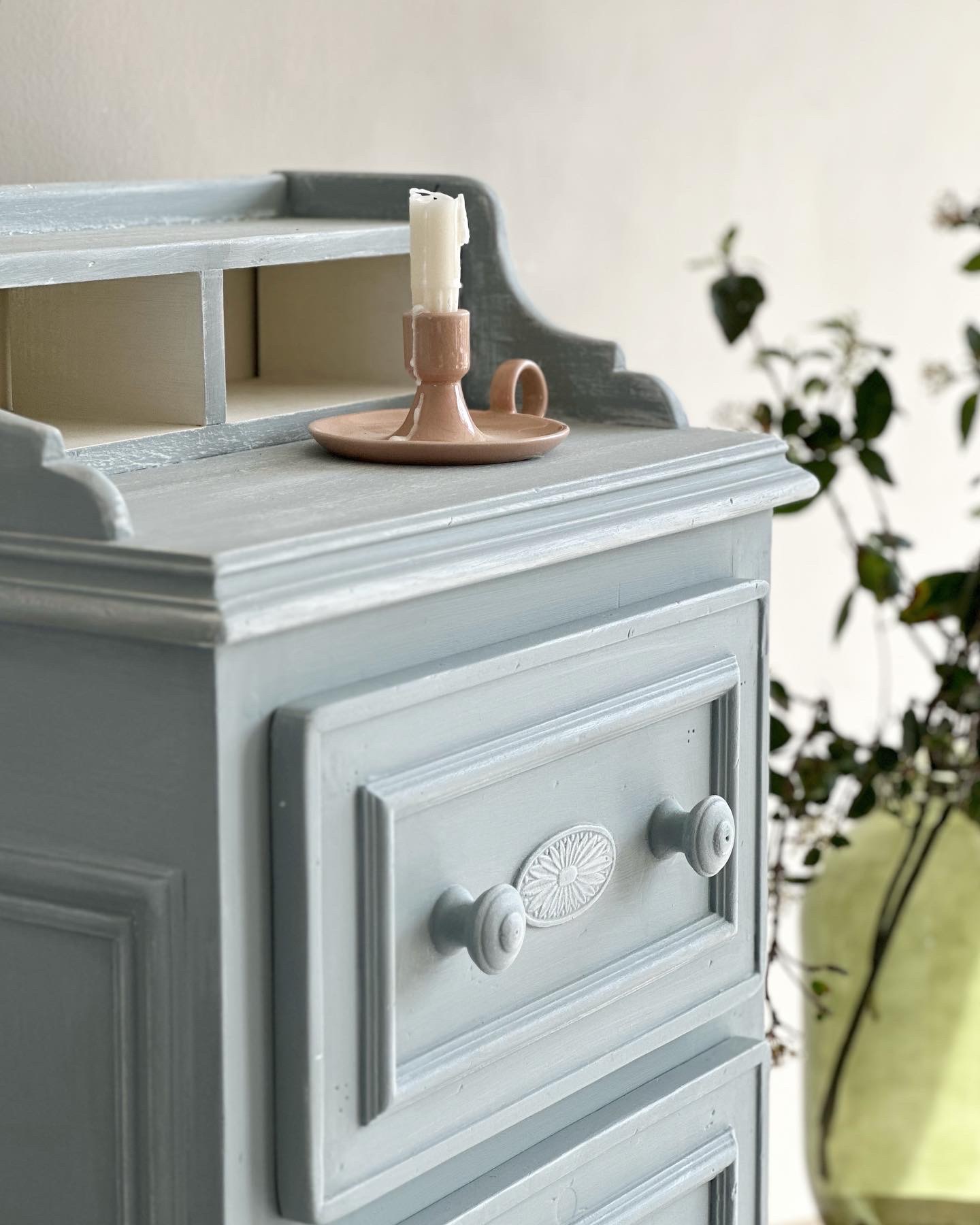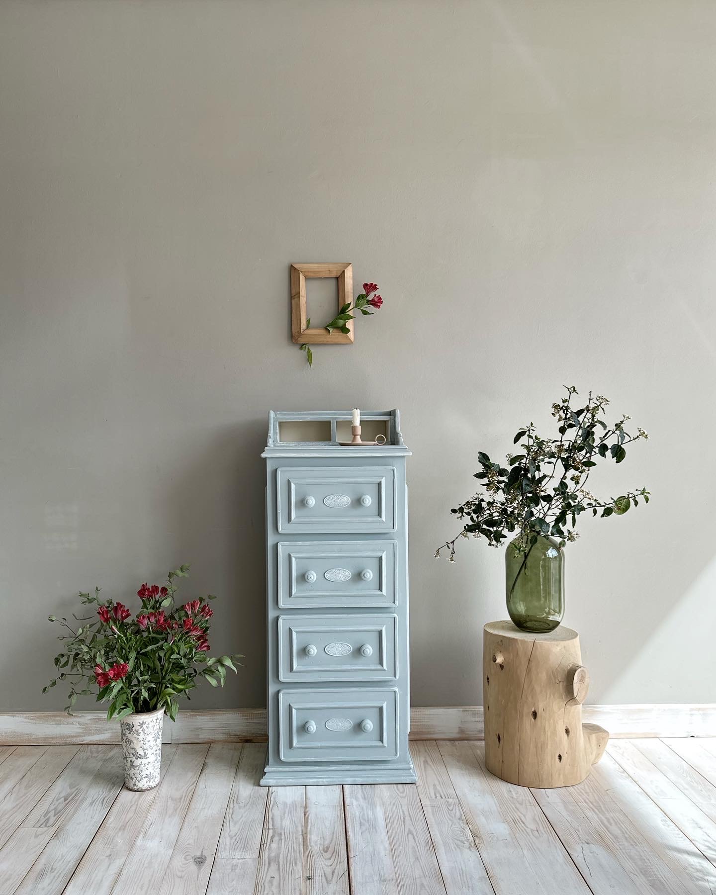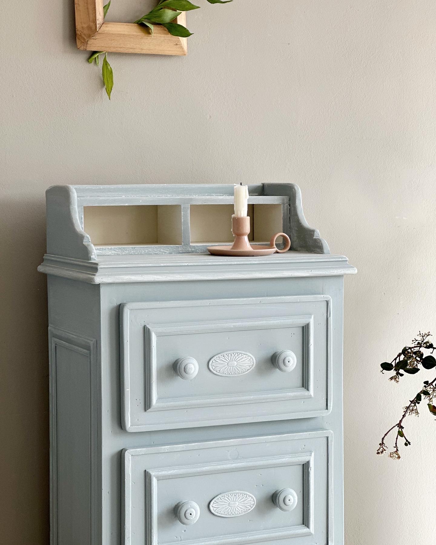 Una pieza con luz propia, única y singular. Si te gusta el color azul escandinavo y un estilo vintage, esta cajonera de gran capacidad es lo que estas buscando. De madera maciza de pino.