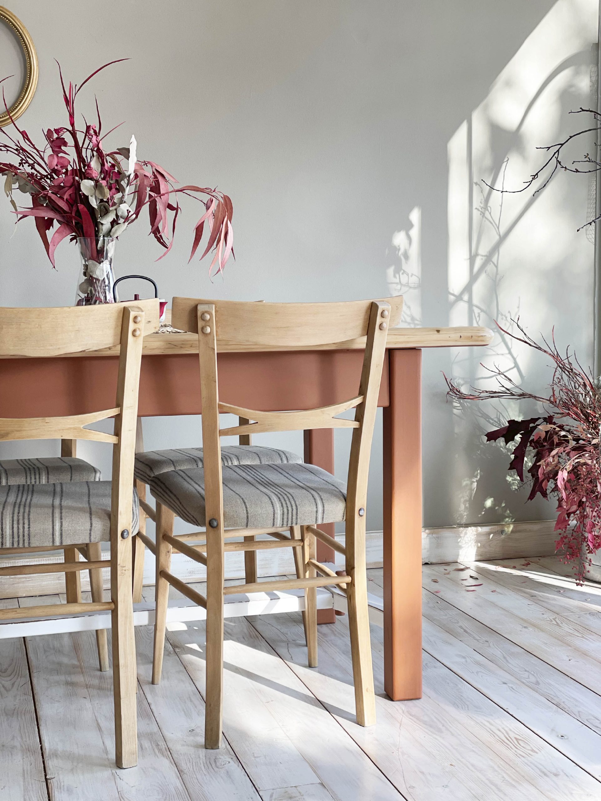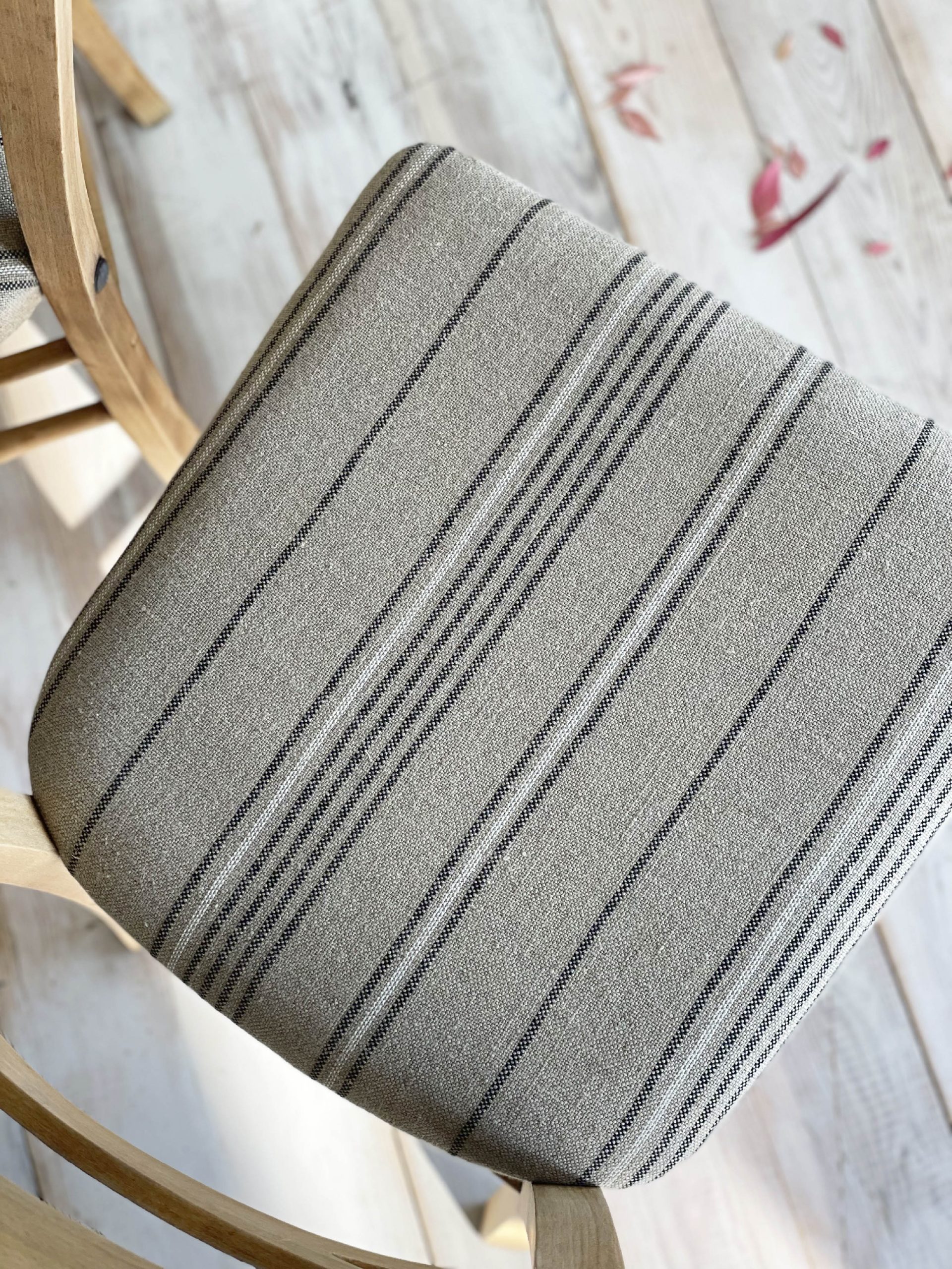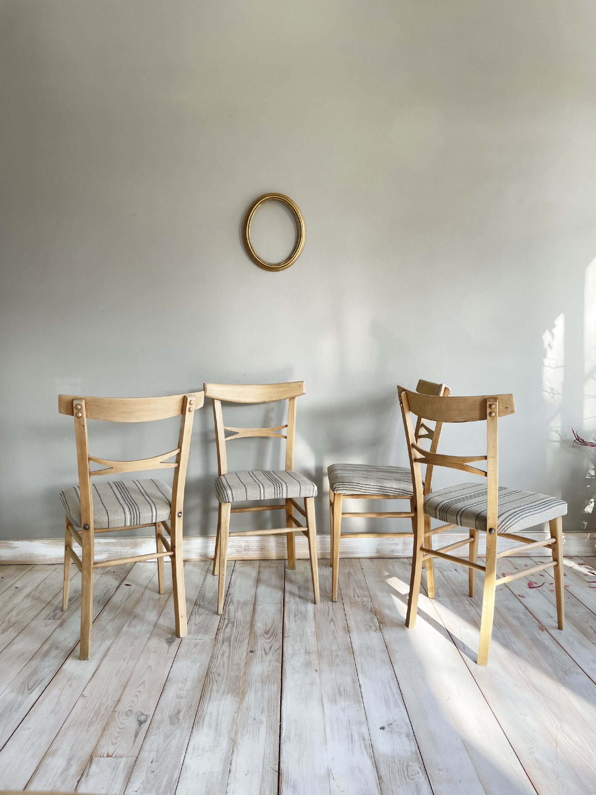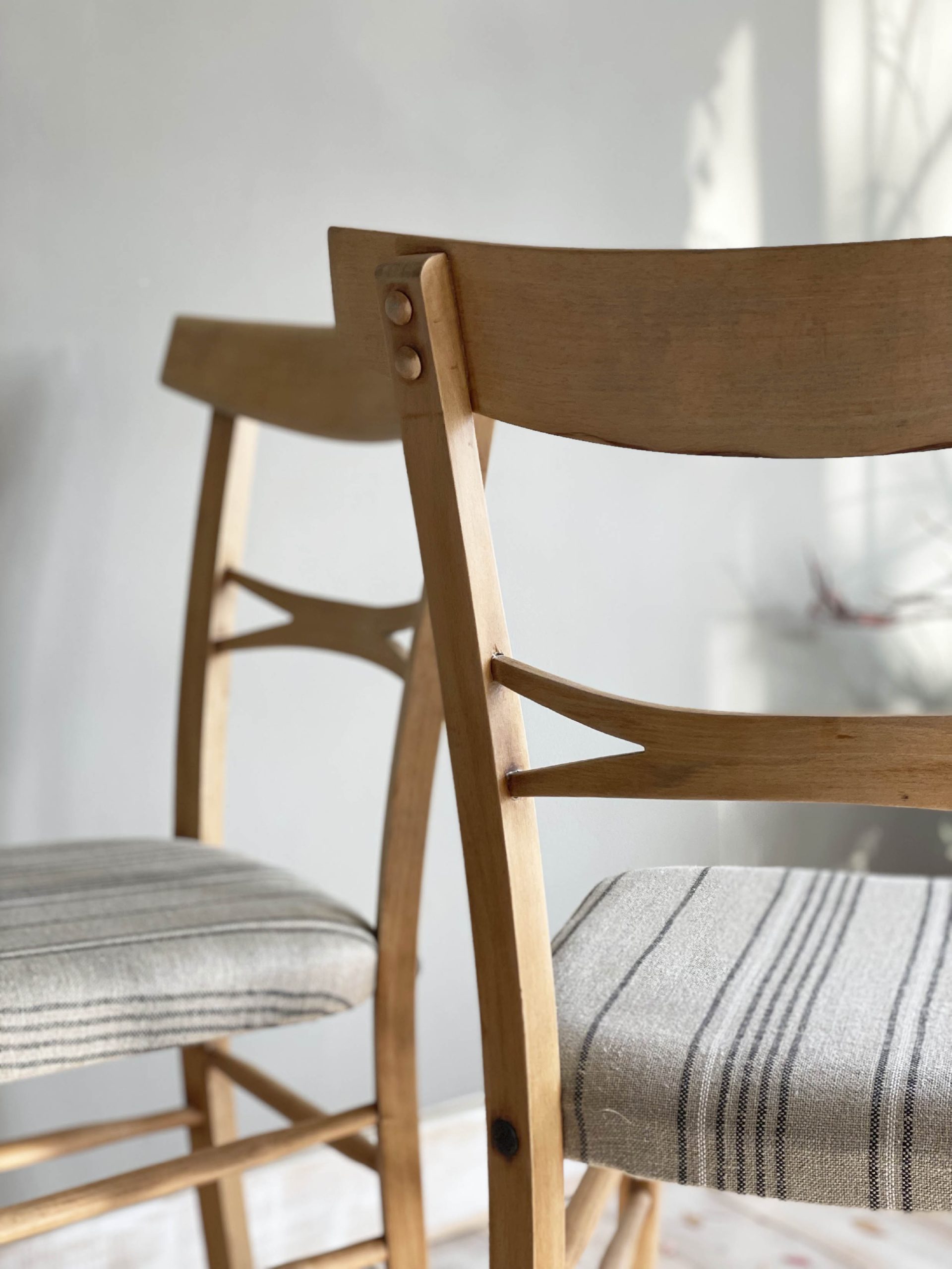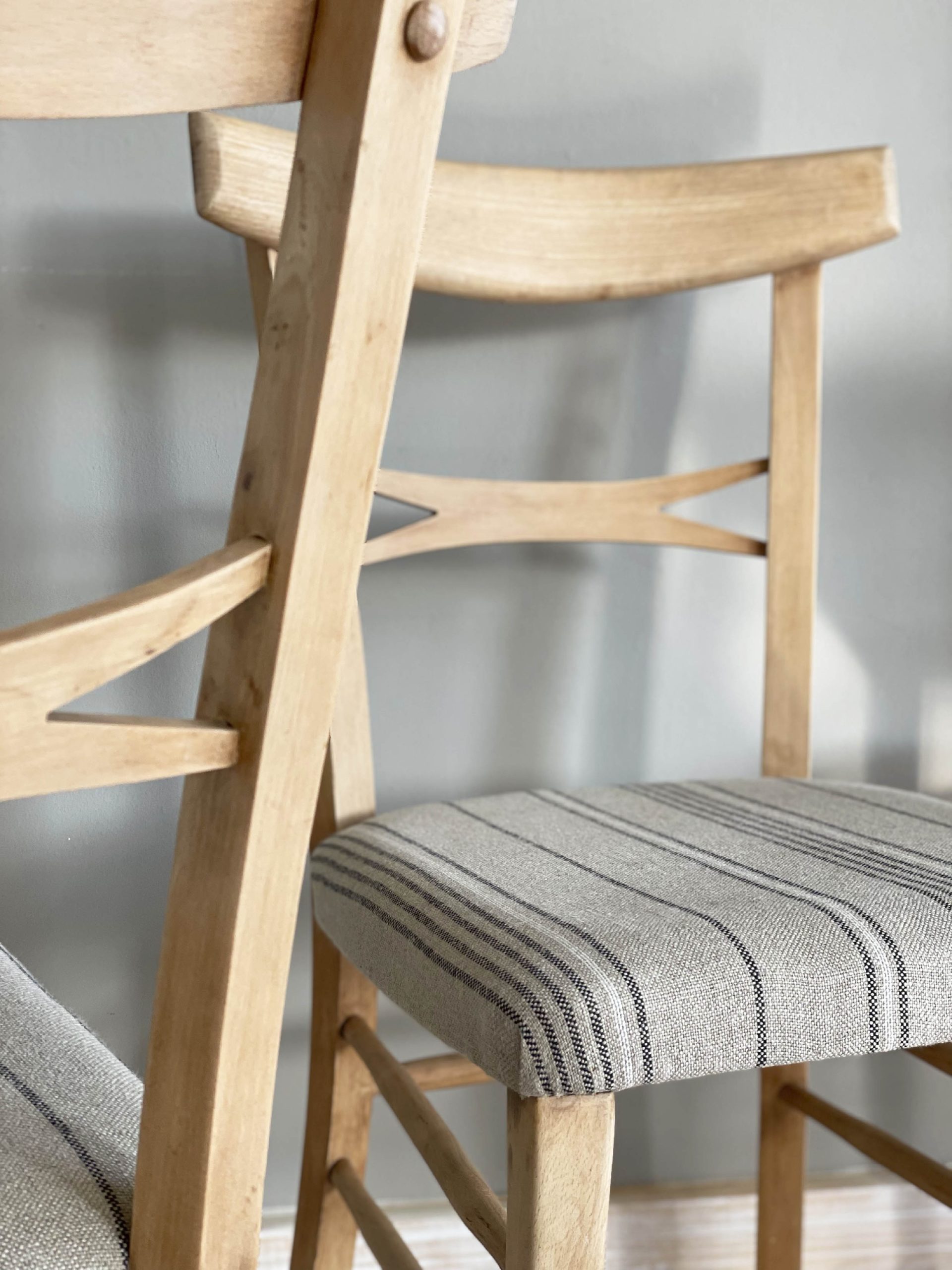 Un conjunto de sillas de diseño que será el complemento perfecto para tu mesa de comedor o cocina. Nos recuerda a los años 60 y nos aporta naturalidad al dejar la madera de haya en su estado más puro. Tapizadas en lino en un motivo a rayas, consigue hacer la pieza más actual y singular.